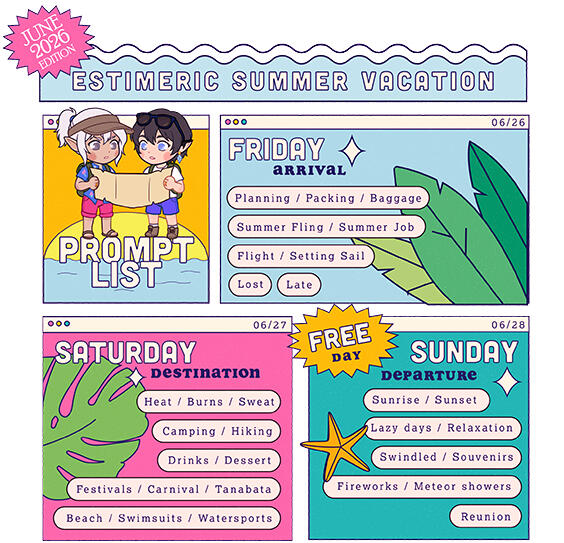 Post what you made on June 26th - June 28th.We have the prompts split up between all three days, but don't sweat it if your posting day doesn't match up. Create as many or as few fanworks as you'd like.Be sure to tag your work with #estimericsummer26 so we can cheer it on!